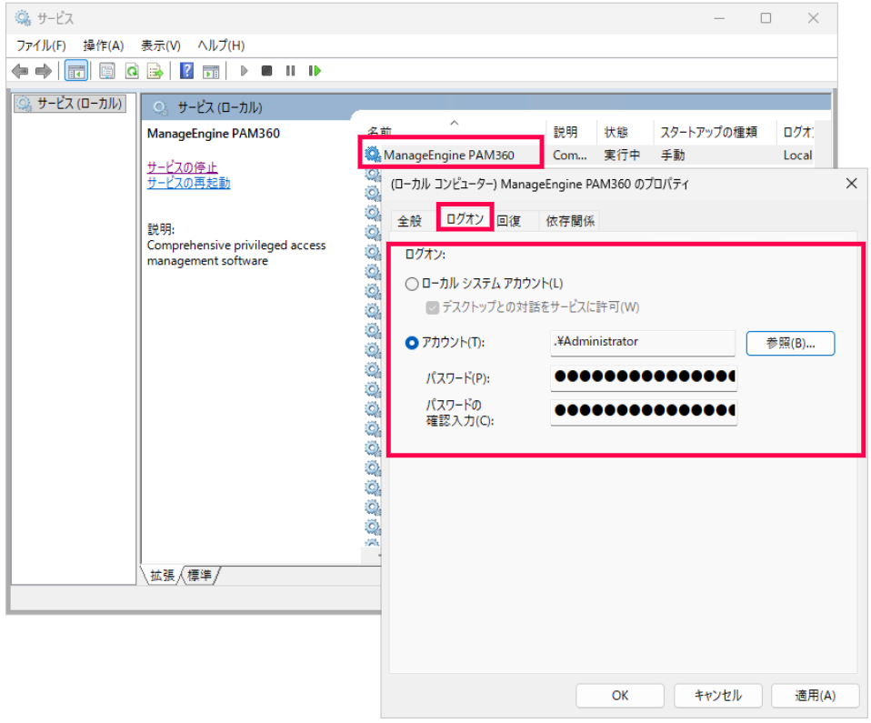サービスのログオンアカウントの確認方法(Windows) 作成日:2026年2月20日 | 更新日:2026年3月3日 設定と操作 PAM360サーバーにログインします。 Windowsキー+Rを同時に押します。 「services.msc」と入力し[OK]をクリックします。サービス画面が開きます。 サービス画面で「ManageEngine PAM360」を右クリックし、[プロパティ]をクリックします。 プロパティ画面が開きます。 プロパティ画面の[ログオン]タブを開きます。このタブ内に表示されているアカウントがPAM360サービスのログオンアカウントです。 このナレッジの総閲覧回数: 30 関連記事: PAM360の起動、停止方法 ライセンスの適用方法 インストールディレクトリのバックアップ、リストア Password Manager ProからPAM360への移行方法
