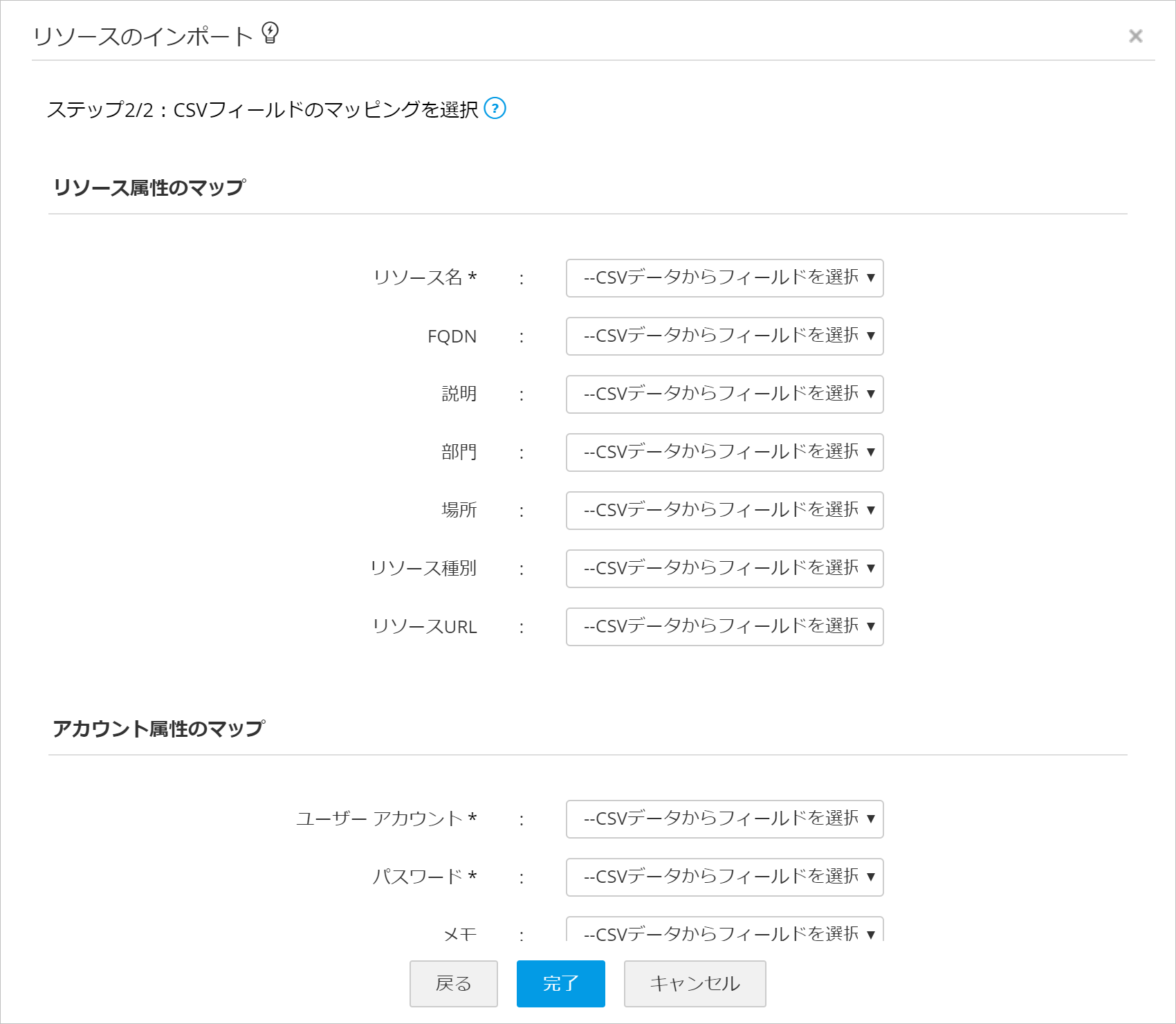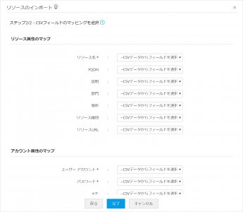 (5)(1)にて示した各属性に対応する値(1行目のレコード内の値)をプルダウンリストから選択します。ファイルにて記載の無い属性については、何も選択する必要はありません。