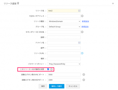 (2) リソース種別がWindows Domain の場合には、「このリソースへのRDP接続を制御」にチェックを入れます。