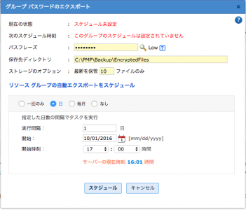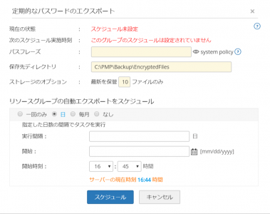 以降は設定したスケジュールにより、指定した保存先に出力されます。スケジュールを編集する場合は、[定期的なパスワードのエクスポート]をクリックするとスケジュール編集が可能です。エクスポートしたファイルを開く際に、スケジュール設定で入力したパスフレーズを入力することでエクスポートしたパスワードの参照が可能です。