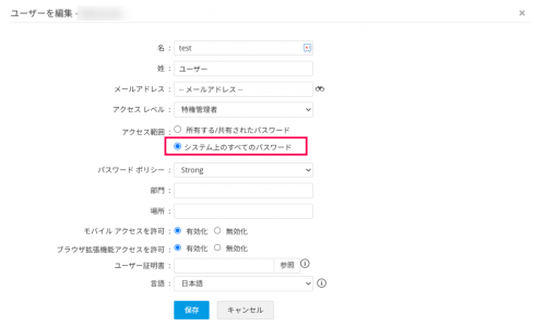 2. [ユーザーを編集]より、アクセス範囲を[システム上のすべてのパスワード]に変更