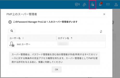 3.管理コンソール右上の、星付き人型アイコンからPassword Manager Pro内のスーパー管理者を確認可能です。