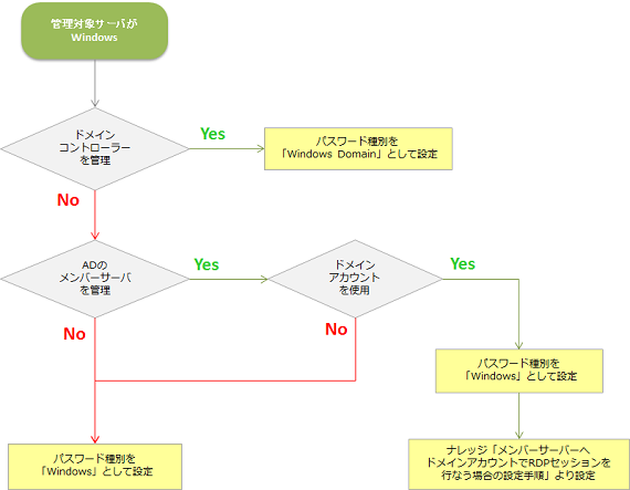 パスワード管理対象がWindowsサーバーの場合、管理対象アカウントやサーバーの種類により、Password Manager Pro上での登録方法が異なります。そのため、下記のフローチャートに従って、Windowsデバイスを登録してください。