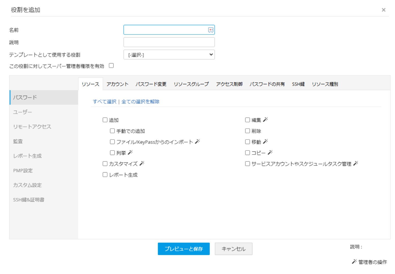 Password Manager Proでは、デフォルトのオペレータの役割として、5種類(管理者・特権管理者・パスワード管理者・パスワード監査・パスワードユーザー)ございますが、ビルド8702よりチェックボックスを使って、ユーザーの操作権限を詳細にカスタマイズした役割を作成することが可能です。管理者の操作内容が使用できる役割は、管理者ライセンスとしてカウントされます。