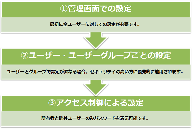 ※スーパー管理者は、パスワード表示が有効であれば、アクセス制御設定によらず表示することが可能です。