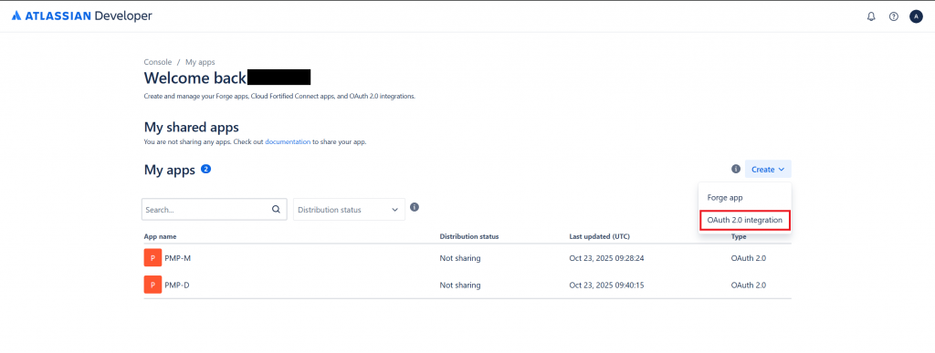 - ダッシュボード上で[Create]→[OAuth 2.0 integration]をクリックします。