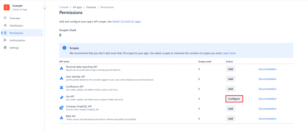 - 連携に必要な認証トークンのスコープを設定します。PMPのチケットシステム連携に必要なスコープは[View Jira Service Management request data]です。まず、「Jira API」横の[Configure]をクリックします([Add]の表示をクリックすると[Configure]に変化します)。