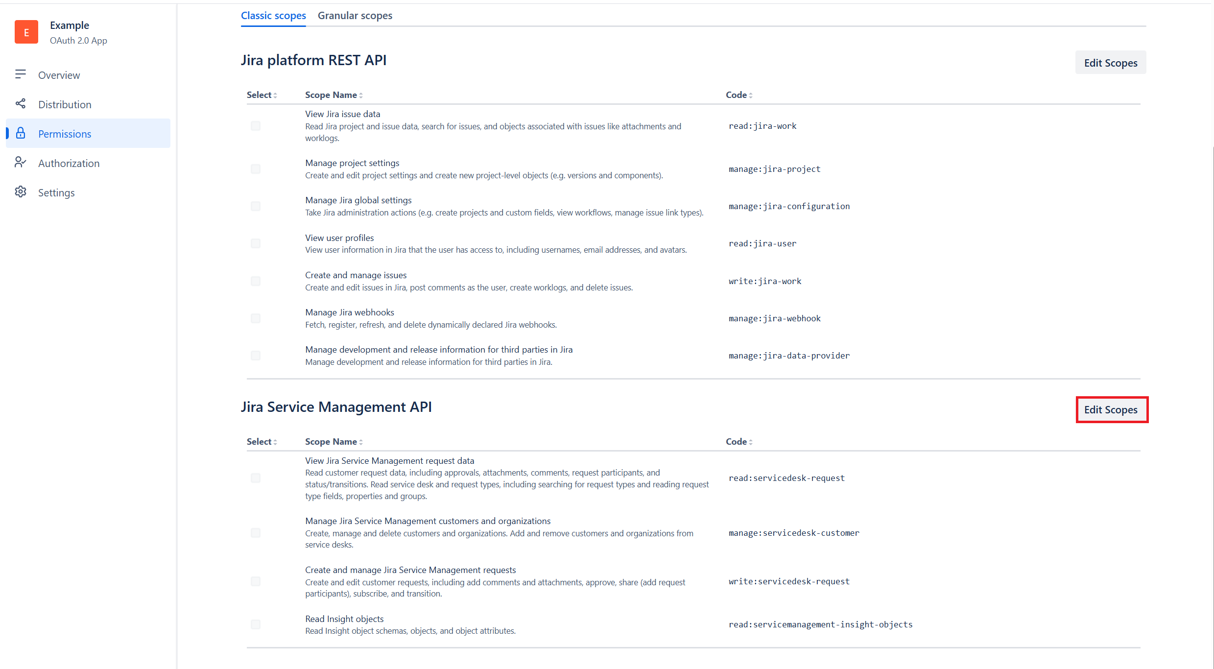 - 「Jira API」詳細画面の[Jira Service Management API]右側の[Edit Scopes]をクリックします。