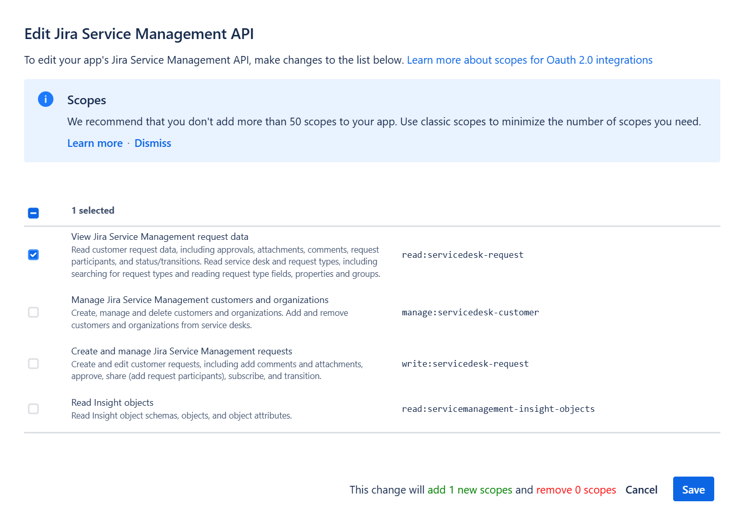 - 表示される画面上で「View Jira Service Management request data」をチェックし、[Save]をクリックします。