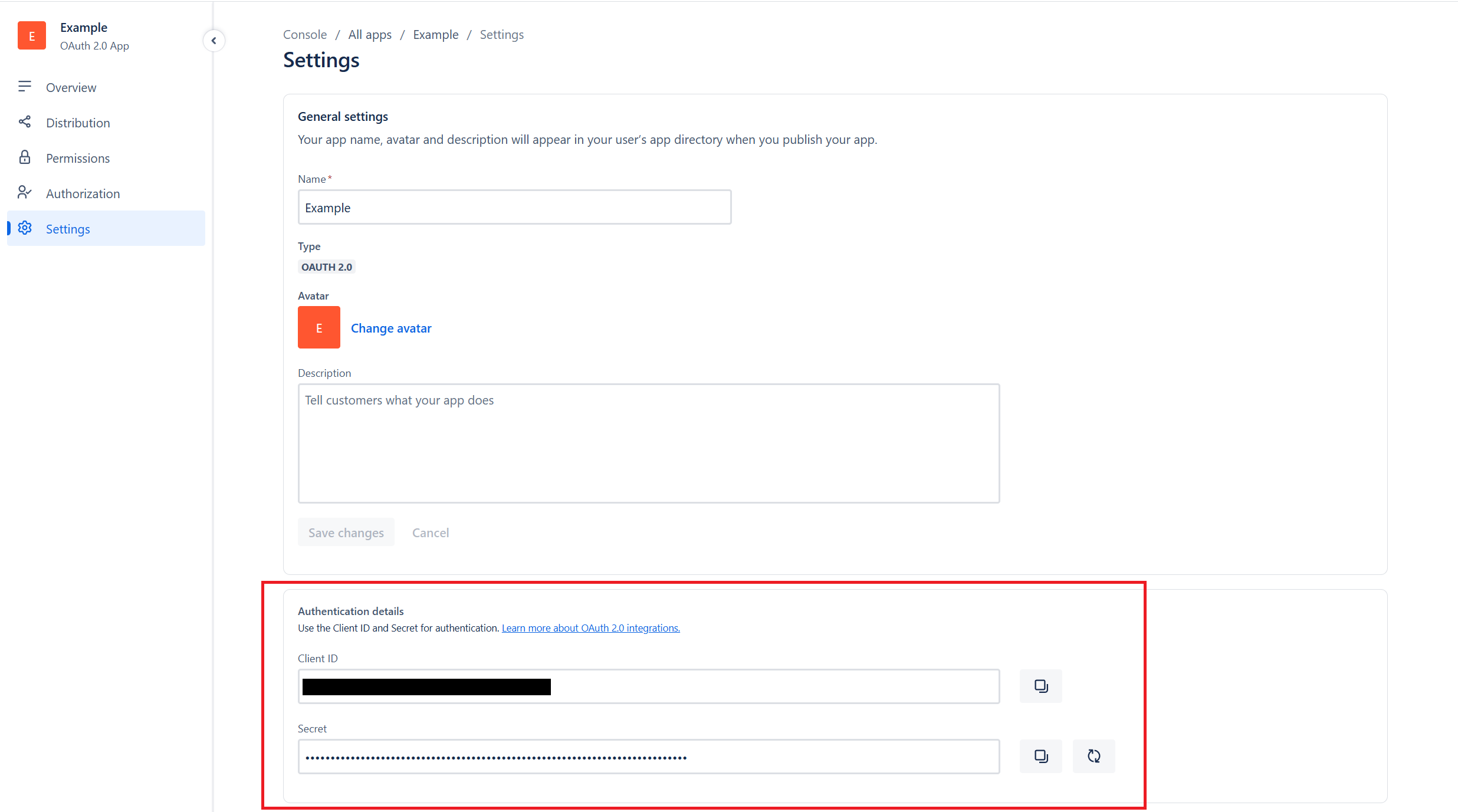 - ダッシュボード左メニューの[Settings]をクリックします。ここまでの作業が完了していると、画面上でOAuth 2.0のクレデンシャルを取得できます。「Client ID」と「Secret」の値をそれぞれコピーします。