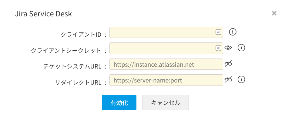 チケットシステムURL:連携したいJira Service ManagementインスタンスのURLを「https://<サブドメイン>.atlassian.net」の形式で入力