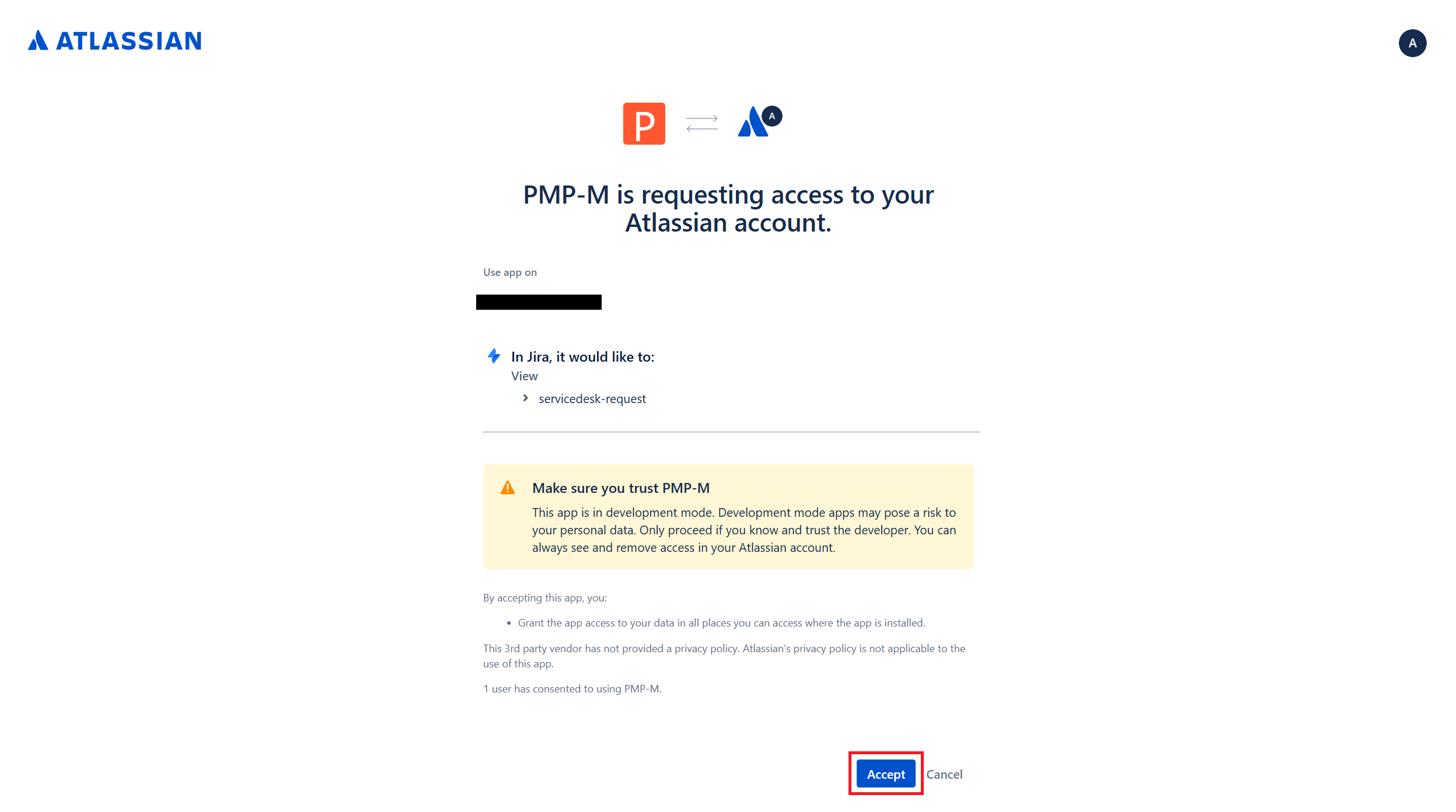 - Jira Service Management APIのauthorization URLへリダイレクトされます。[Accept]をクリックして認証してください。