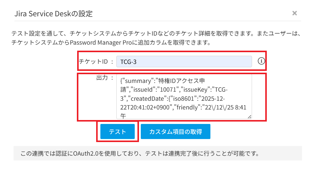 - 「チケットID」にJira Service ManagementのチケットIDを入力します。