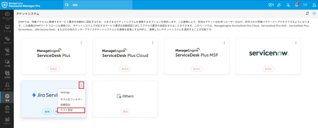 - 「チケットシステム連携」画面の「Jira Service Desk」カードの右上三点のアイコンにマウスオーバーし、[テスト設定]をクリックします。