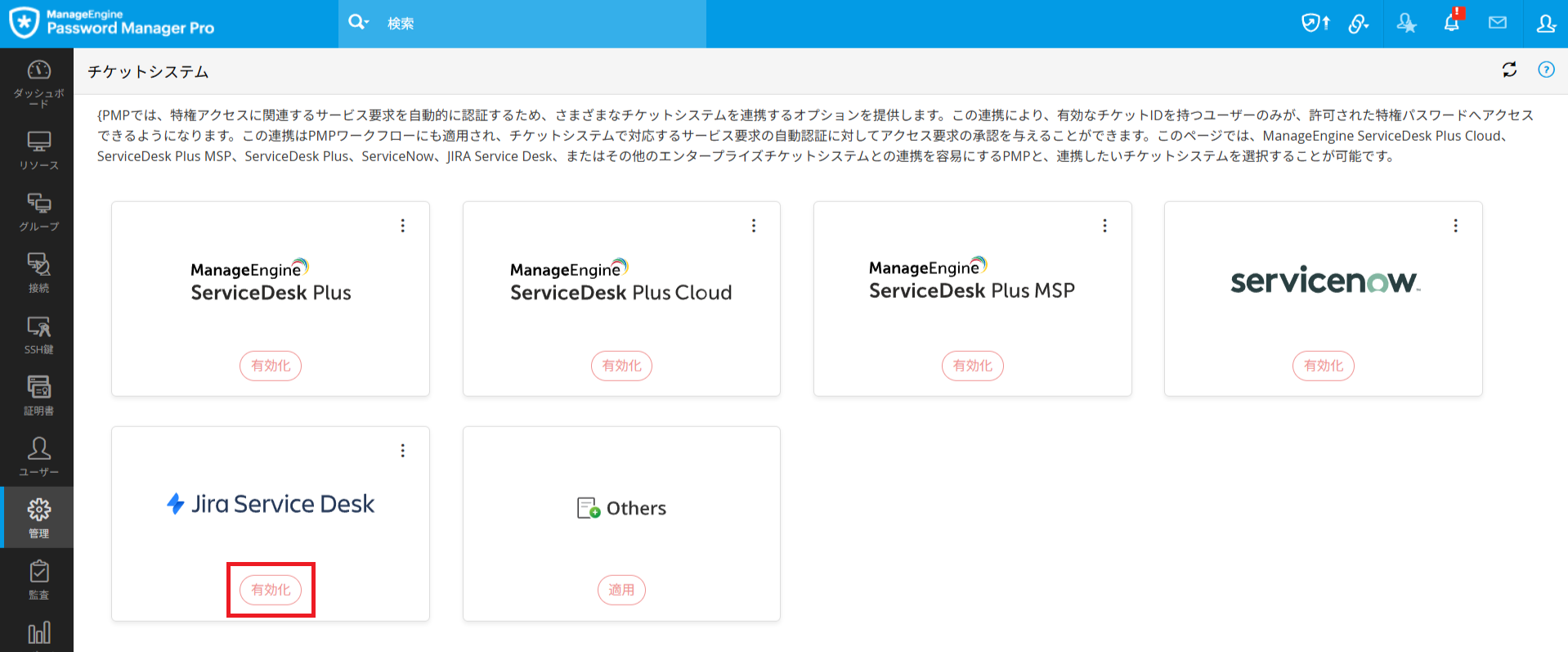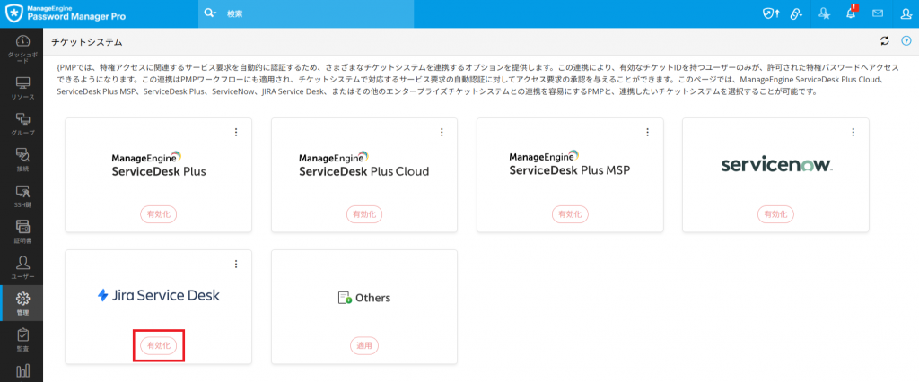 - [管理]→[連携]→[チケットシステム連携]に移動し、チケットシステム連携の設定画面に移動します。「Jira Service Desk」カードの[有効化]をクリックします。