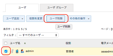 - adminユーザーを選択し、[ユーザー削除]ボタンをクリックします。