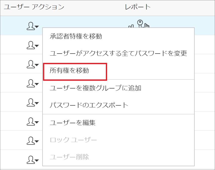 [ユーザー]タブへ移動し、ユーザーアイコン(ユーザーアクション列)の[所有権を移動]から、リソースの所有権を別の管理者へ移動してください。