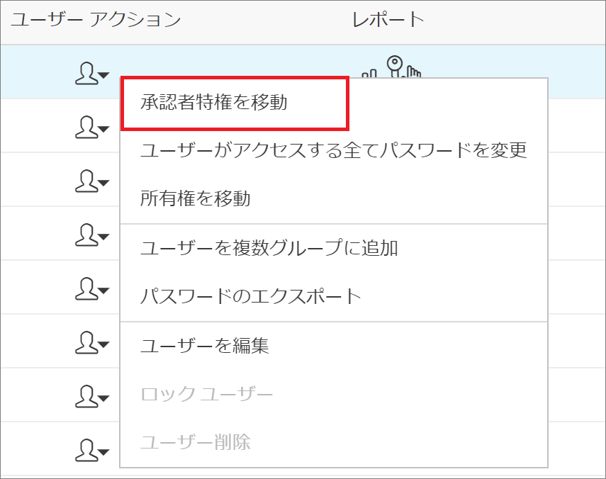 [ユーザー]タブへ移動し、ユーザーアイコン(ユーザーアクション列)の[承認者特権を移動]から、申請の承認者を別の管理者へ移動してください。