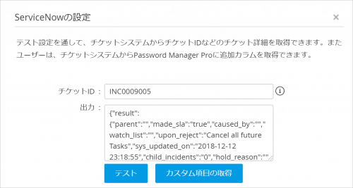 テストを実行するには、詳細設定で[テスト設定]リンクをクリックして、ServiceNowに存在する任意のチケットIDを入力後、テストを実行します。