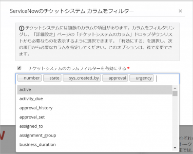 チケットシステムでフィルターを行なうカラムを選択します。フィルターの定義を行なうことで適切なリクエストIDのみが、承認されるように設定可能です。