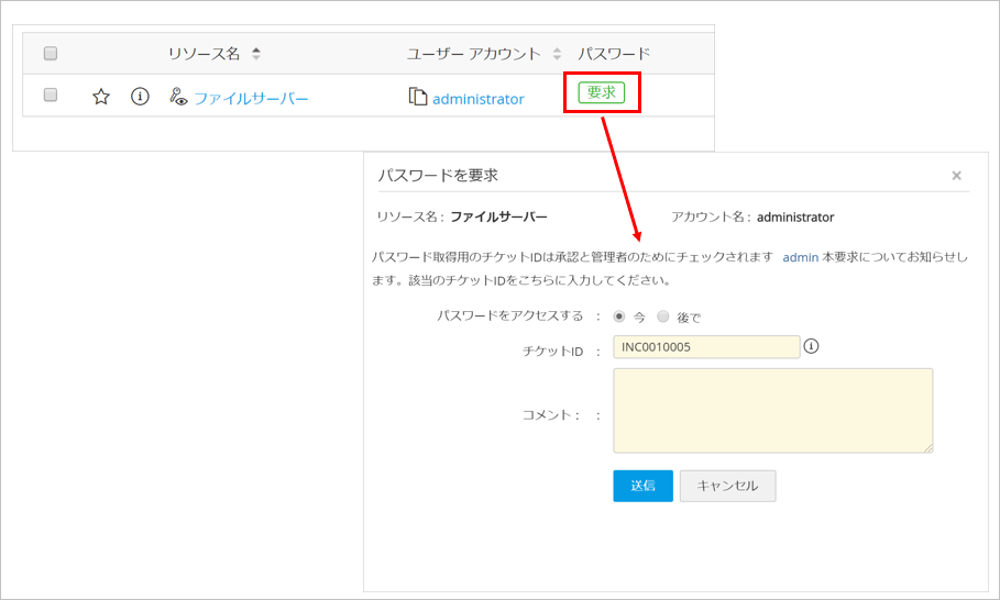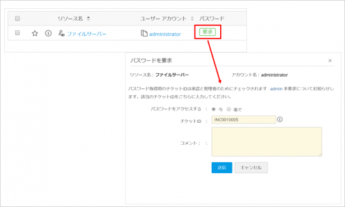 ServiceNow側で生成されたチケットID(申請/承認フローを組み込んだ場合、承認された後)を、利用したいサーバー(ファイルサーバー)を選択して、以下のように[要求]をクリックします。[チケットID]と[コメント]を入力して[送信]をクリックします。