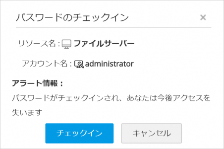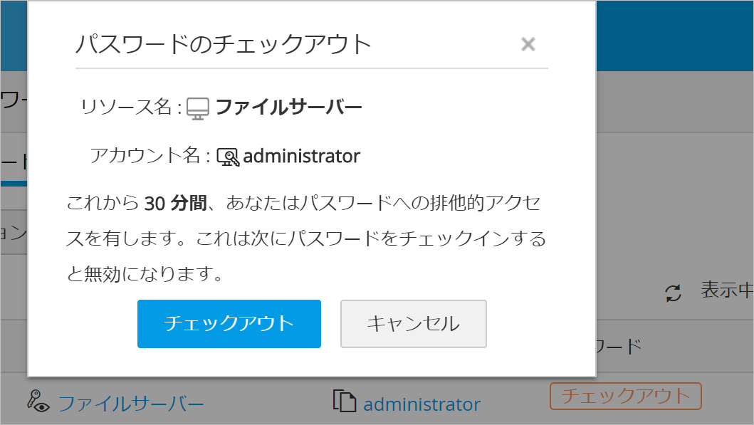 今回は、PMPの自動承認機能を「6. PMP-アクセス制御の設定」にて設定しているため、即座に[チェックアウト]に表記が変わります。[チェックアウト]をクリックすると、[チケットID]入力画面が表示されるため、正しいチケットIDを入力し、ファイルサーバーに接続します。