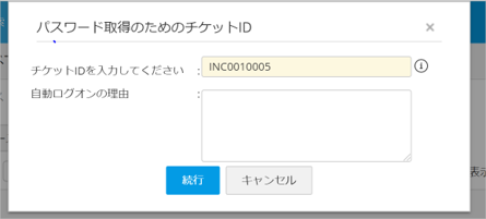 PMPへログイン後、共有されているアカウントの[接続をオープン]をクリックするとチケットIDとコメント欄を入力するためのポップアップが表示され、チケットIDとコメントをそれぞれ入力することで接続が可能となります。