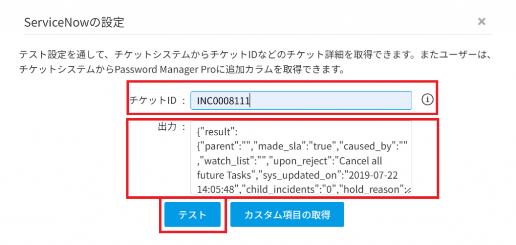 - 「出力」フィールドにチケットの情報が出力されることが確認できた場合は、「チケットシステムを連携して特権IDの利用申請、承認プロセスを高度化する」の「2. 判定条件の設定」に進みます。「出力」フィールドにチケットの情報が出力されない場合は、サポートにお問い合わせください。