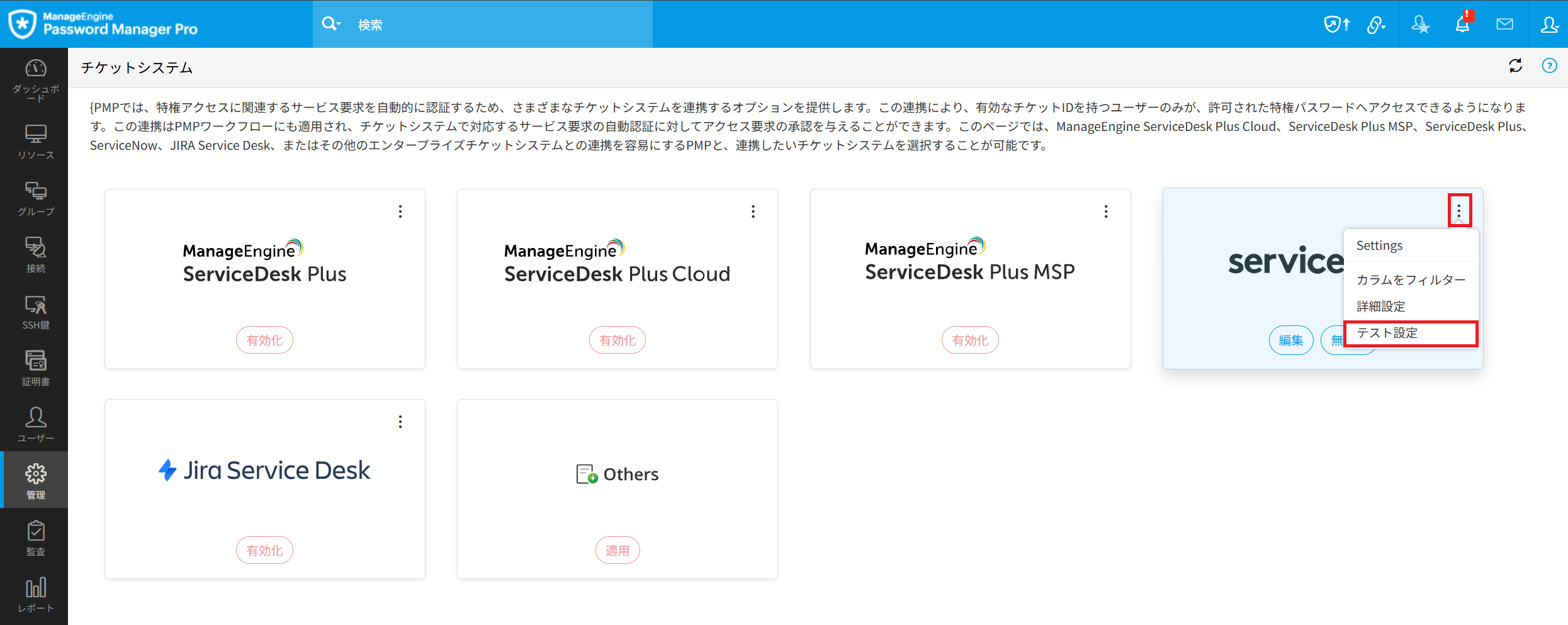 - 「チケットシステム連携」画面の「ServiceNow」カードの右上三点のアイコンにマウスオーバーし、[テスト設定]をクリックします。