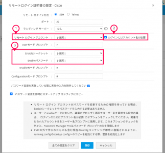 [該当のリソース名の右横のアカウントアクション]→[パスワード変更用の資格情報を設定]画面で、リモートログインアカウント、Userモードプロンプト、Enableシークレット、Enableパスワード、Enableモードプロンプト、Configurationモードプロンプトを設定してください。