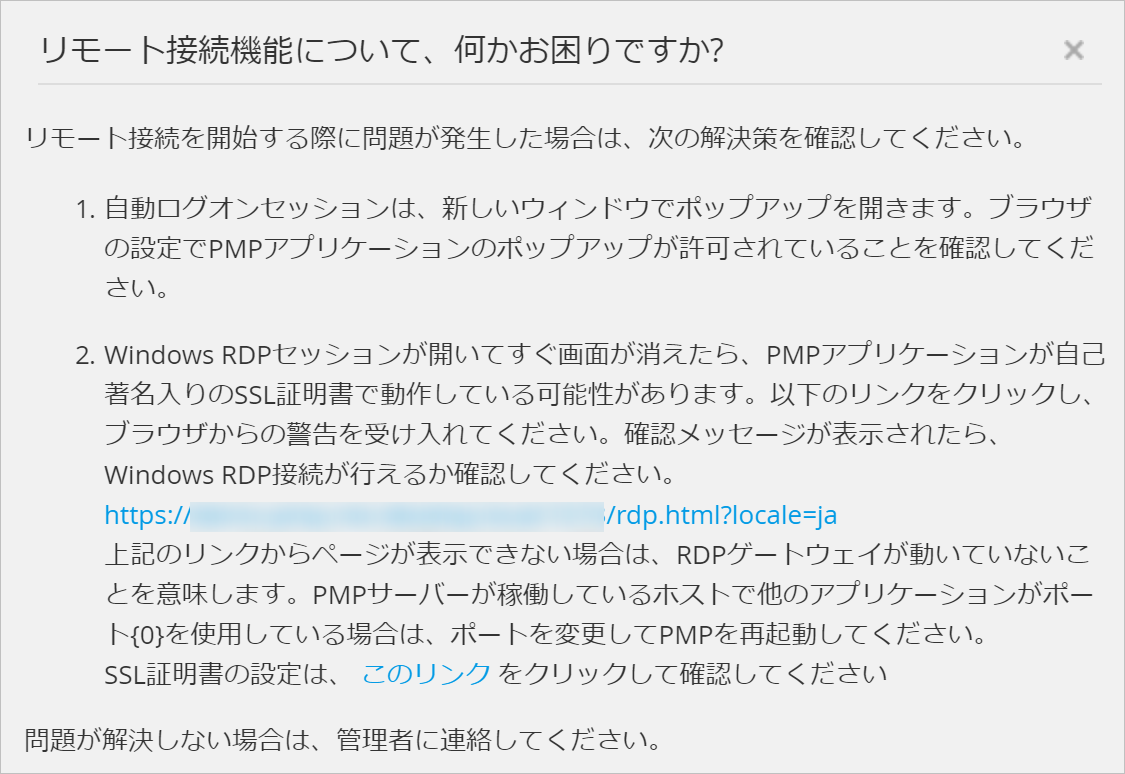 Windowsサーバーにエラーなく接続できるようにするため、Password Manager Proサービスの再起動後、[リソース]タブ内の[リモート接続機能について、何かお困りですか?]から、「https://<FQDNまたはIPアドレス>:<ポート番号>/rdp.html?locale=ja」をクリックし、ブラウザの警告を許可してください。