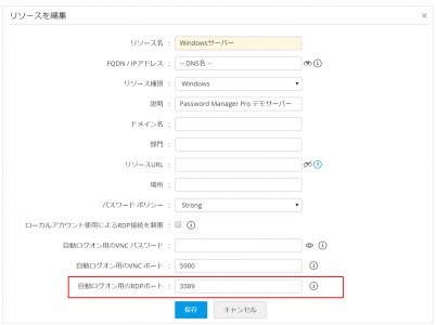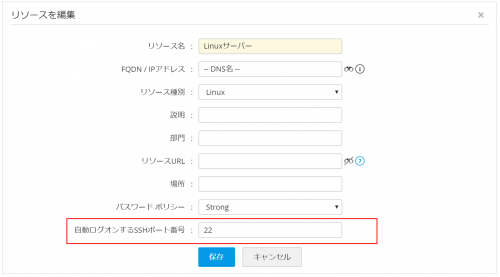 Password Manager Proで管理しているリソースへ自動ログオンする際に、CLIではTELNET、SSHでの接続、WindowsではRDPによる接続が可能ですが、接続先のポート番号がデフォルトのポート番号と異なる値の場合、リソースの編集画面でそれぞれ指定することが可能です。
