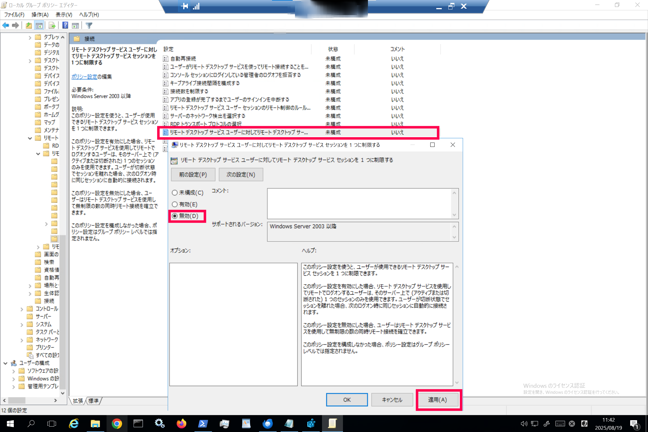 ただしWindowsサーバーにて複数のセッションを許可するように設定する必要があります。
