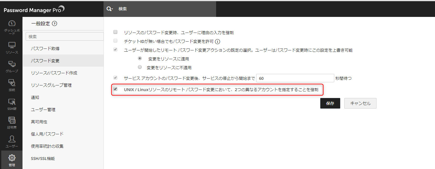 注意:アカウントを1つのみ使用する場合は、[管理] > [一般設定] > [パスワードリセット] にある、「UNIX / Linuxリソースのリモート パスワード リセットにおいて、2つの異なるアカウントを指定することを強制」のチェックボックスをオフにしてください。