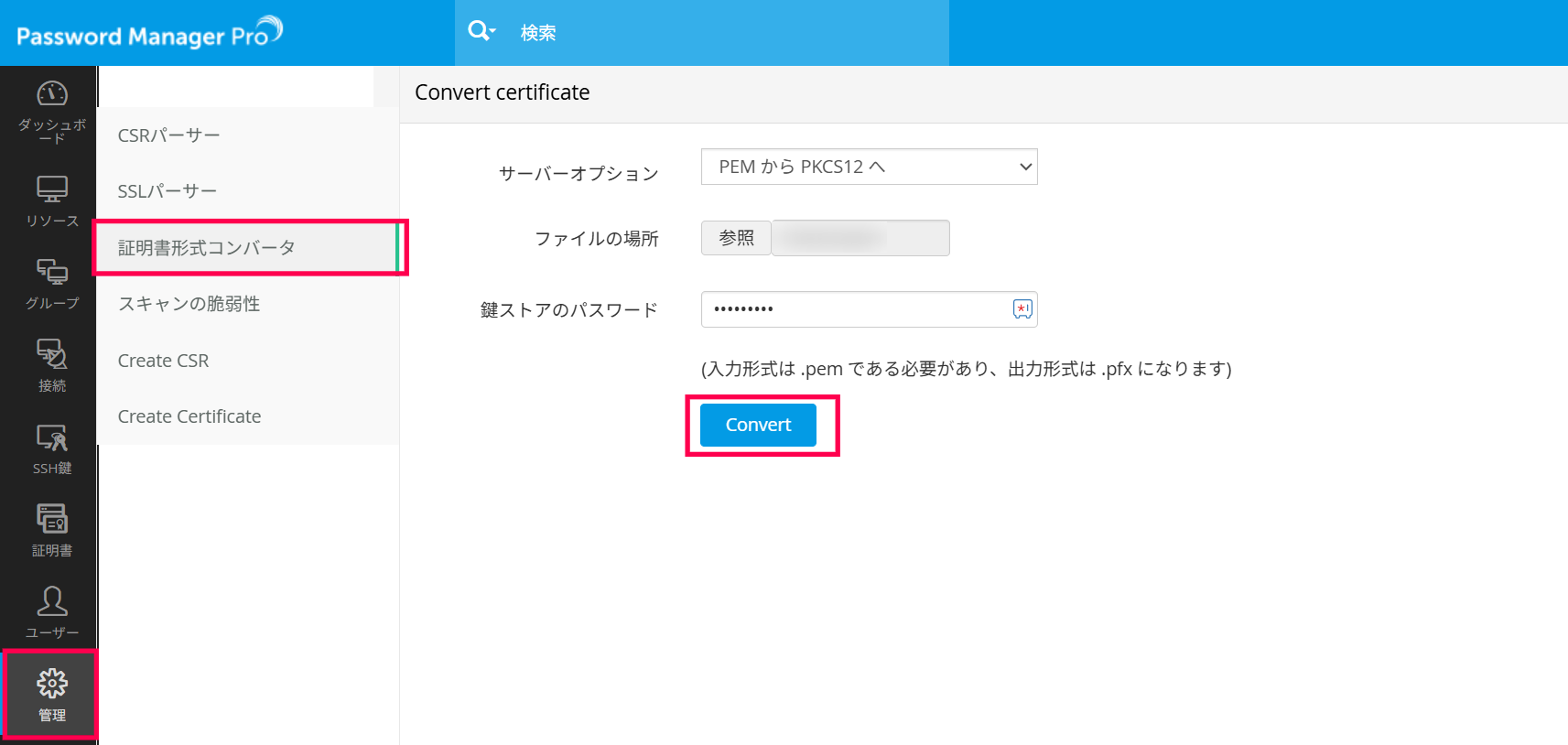 - [管理]タブ→[SSL証明書]→[証明書ツール]→[証明書形式コンバータ]へと進みます。