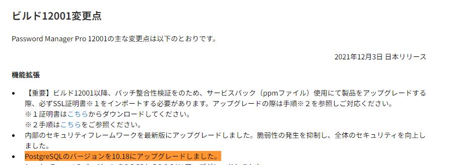 | 12400~12460 | 13000 | サービスパック (12400/12401/12410/12420/12430/12450/12460から13000へ) ManageEngine_PasswordManager_Pro_12_4_0_SP-1_0_0.ppm |