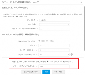 表示された画面で以下の赤枠でrootユーザーを指定し保存