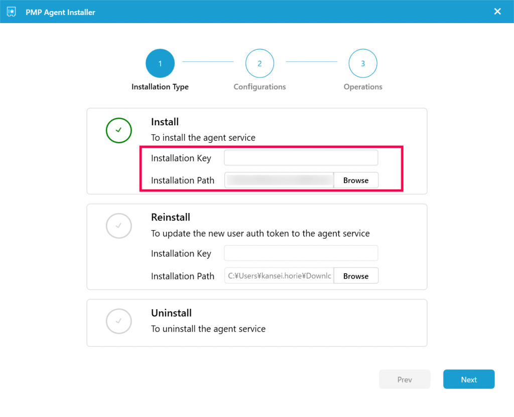 - エージェントキーとインストールするフォルダーを記載し、[Next]をクリックします。