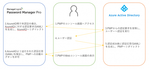 異なるドメイン間でユーザー認証情報(SAML)を交換するXMLベースの標準規格です。IdP(Identity Provider)とSP(Service Provider)の2つの構成要素によってシングルサインオンを実現します。AzureAD(IdP)が認証基盤となり、PMP(SP)へのシングルサインオンまでのワークフローは以下の通りです。