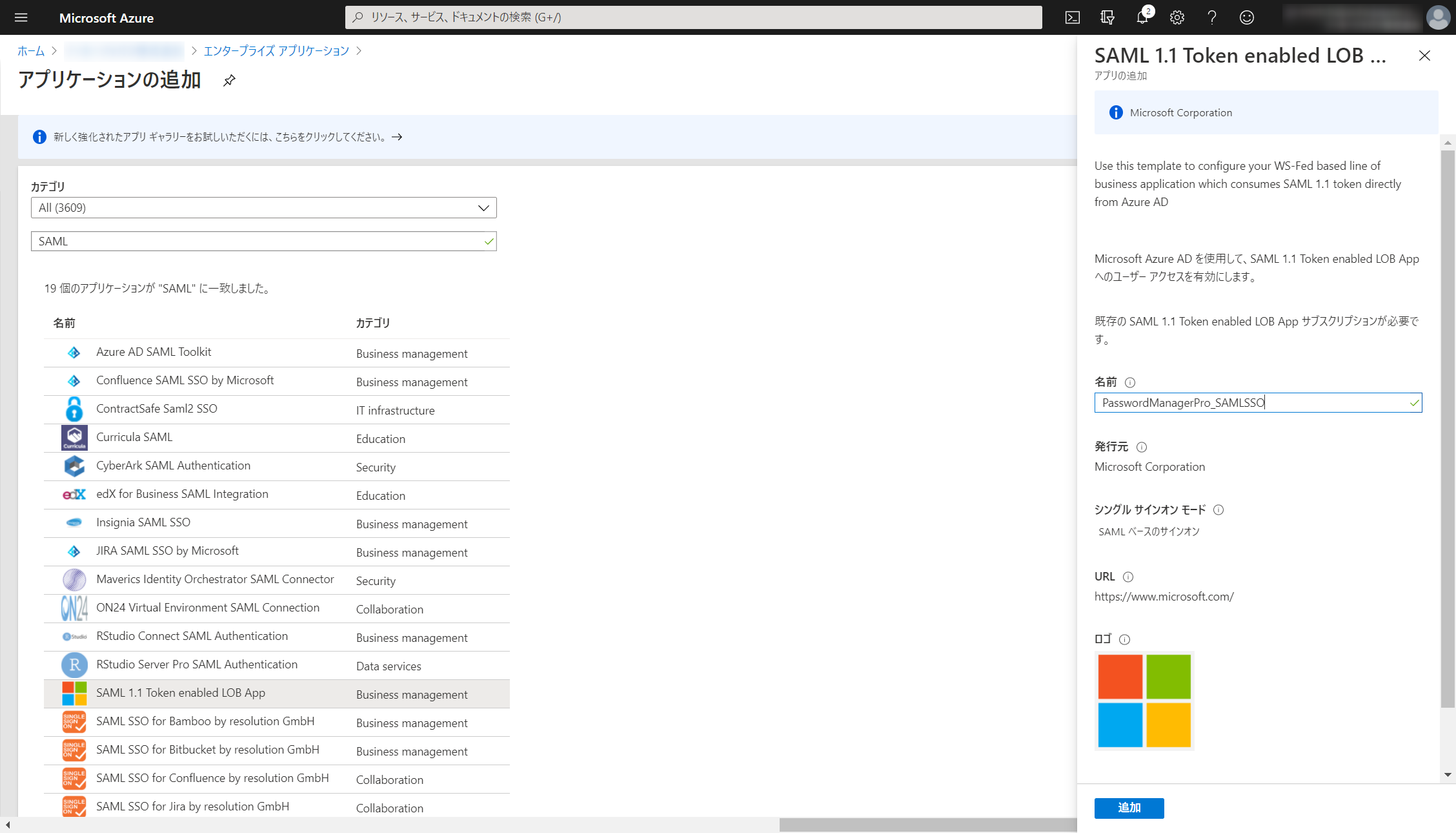 アプリケーションの追加画面にてカテゴリからSAMLで検索し、「SAML 1.1 Token enabled LOB App」を選択します。画面右側に表示されるウィンドウにてアプリケーションの名前を任意で変更した後に、「追加」をクリックします。
