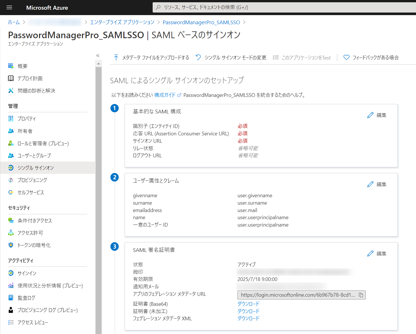 AzureADポータルにて作成したSAMLアプリケーションの「シングルサインオン」タブへと進み、「SAML署名証明書」欄の「フェデレーション メタデータ XML」をダウンロードします。