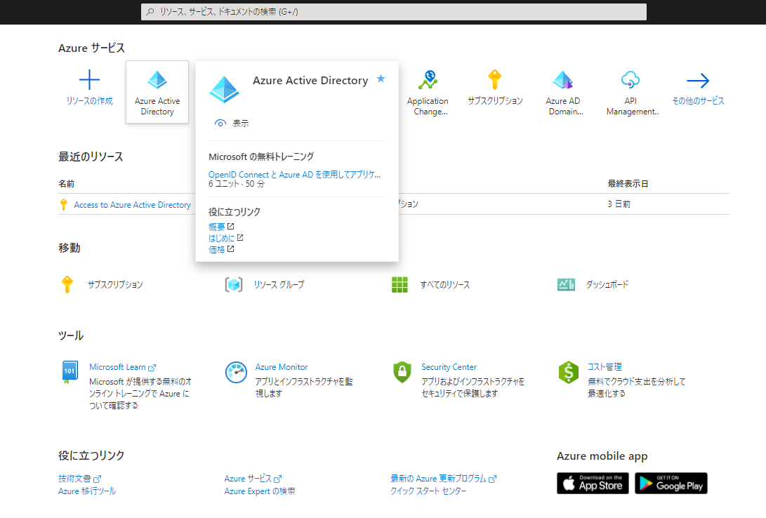 AzureポータルからAzure Active Directoryコンソール画面へ移動する。