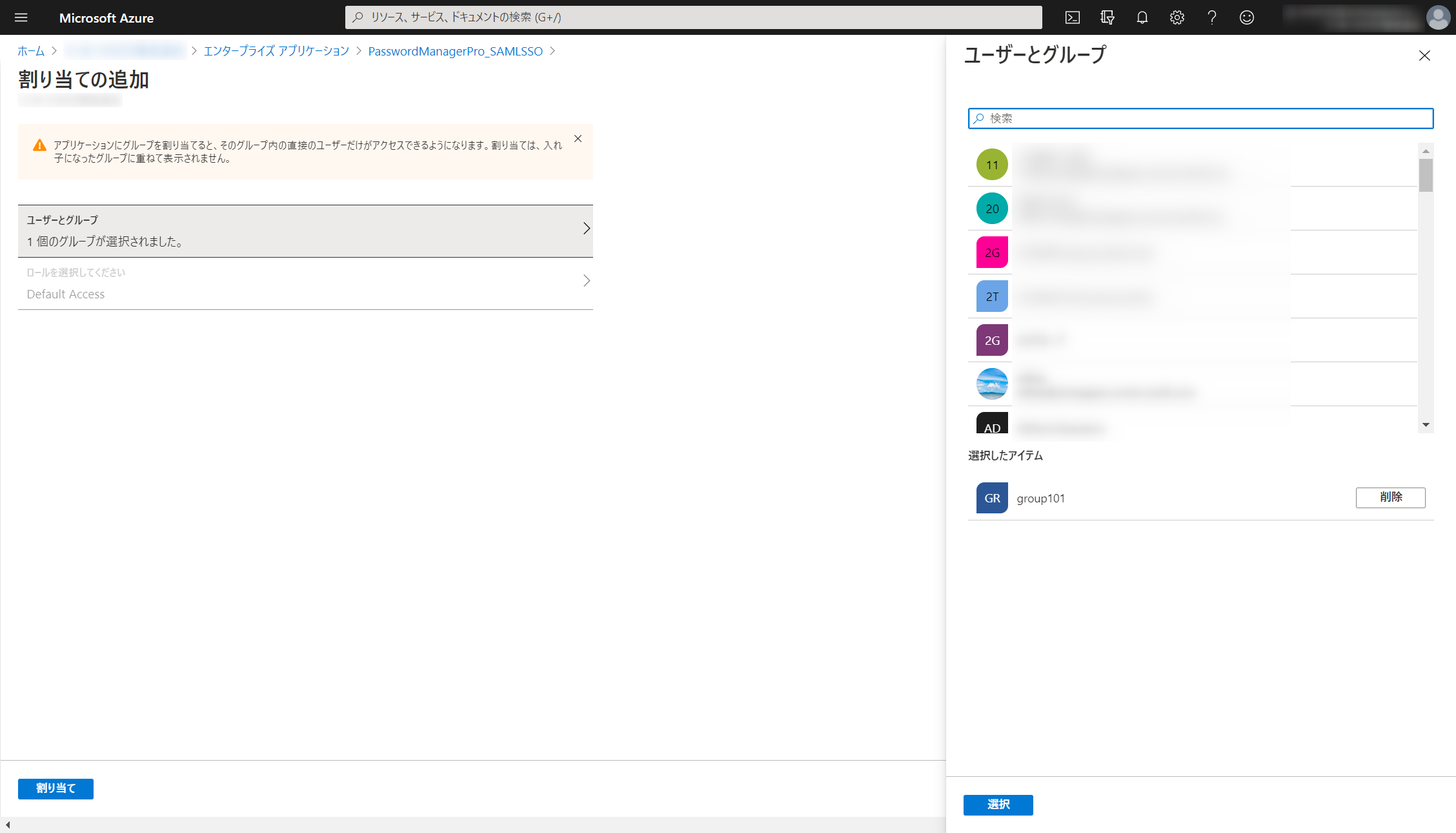 SAML認証を適用するユーザまたはユーザーグループを「選択」し、「保存」をクリックします。