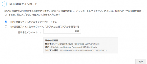 取得した「フェデレーション メタデータ XML」をPMPにてアップロードします。「アップロード」ボタンをクリックした後に、ブラウザーをリフレッシュしてください。