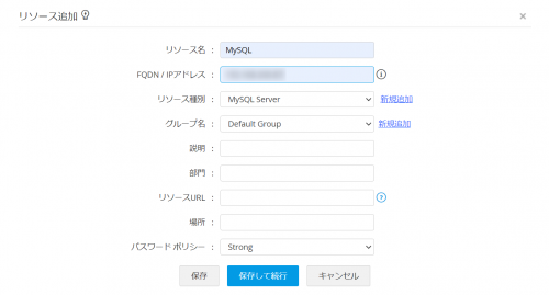 - リソース名(任意)とFQDN/IPアドレスを入力し、リソース種別をで[MySQL Server]とし、それ以外の項目は任意で入力します。「保存して続行」をクリックします。