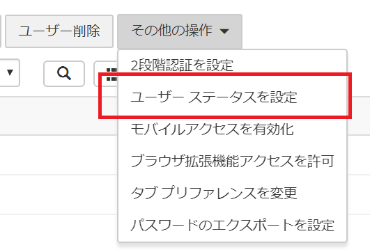 (1)ユーザータブの対象ユーザーにチェックをし、[その他の操作]->[ユーザーステータスを設定]をクリック