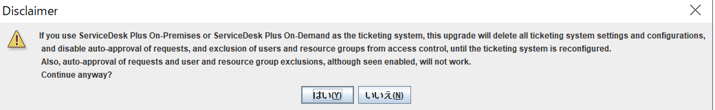 (注意事項内容訳:チケットシステムとしてServiceDesk Plus On-PremisesまたはServiceDesk Plus On-Demandを使用している場合、このアップグレードによりチケットシステムの設定がすべて削除され、チケットシステムが再設定されるまで、要求の自動承認、ユーザーやリソースグループのアクセスコントロールからの除外機能が無効になります。)