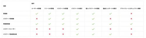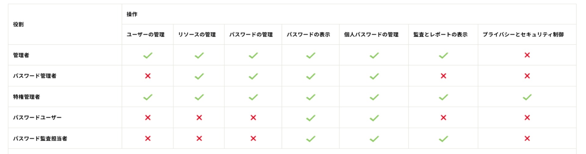 PMPユーザー権限の違い 作成日:2016年2月24日 | 更新日:2025年2月14日 機能と仕様 Password Manager Proを使用するユーザーへ権限を付与することが可能ですが、本ナレッジでは各権限で実施可能な機能は以下の表をご参照ください。 図:ユーザー権限と機能対応表 より詳細に権限をカスタマイズすることも可能です。詳細はこちらをご参照ください。 このナレッジの総閲覧回数: 1,673 関連ナレッジ: 排他的アクセスの有効時間について アクセス制御の設定内容について チケット連携システムの設定 ユーザーグループ機能