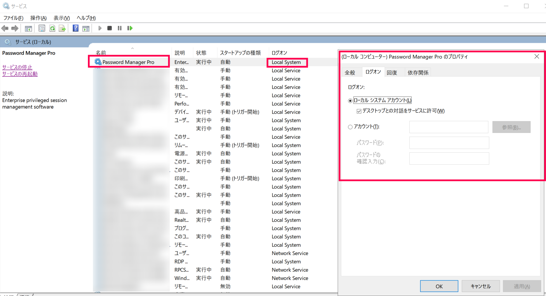 サービスのログオンアカウントの確認方法 作成日:2023年6月30日 | 更新日:2025年8月21日 設定と操作 本ナレッジではサービスログオンアカウントの確認方法について解説します。 Windowsキー+Rキーを押下し[ファイル名を指定して実行]ウィンドウを開きます。 "services.msc"と指定し、実行します。 サービス画面で[Password Manager Pro]を探します。 Password Manager Proを右クリックし、「プロパティ」をクリックします。 ログオンタブに移動し、表示されているアカウントがサービスのログオンアカウントです。 このナレッジの総閲覧回数: 701 関連ナレッジ: Password Manager Proインストールフォルダーのフルコントロール権限を与える アンインストール手順 MS SQLの登録方法 【不具合】PMPコンソール画面右上の通知アイコンが表示されない