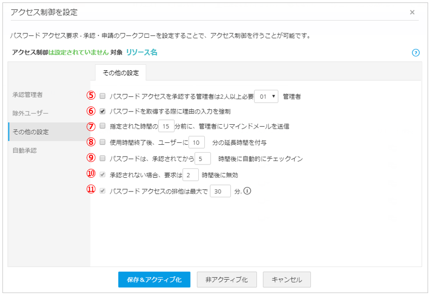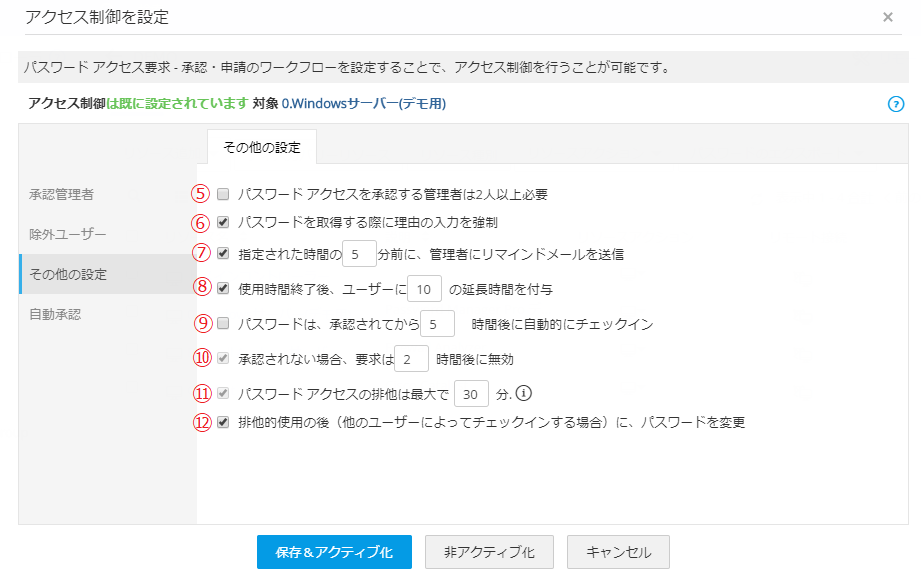 | ⑦ | 保留中のパスワードアクセス要求を処理するために、アクセス開始時刻の「X」分前に承認管理者にリマインドメールを送信 | 使用日時を指定して申請した場合、利用開始時間の何分前に管理者へリマインドメールを送信するかを分単位で指定します。 |